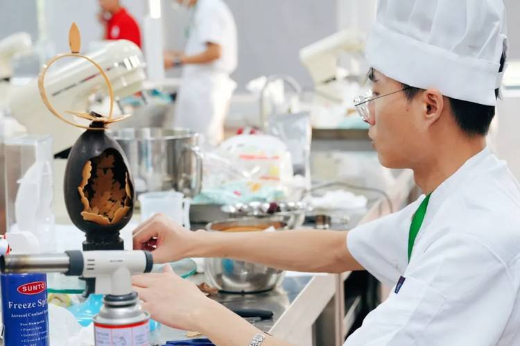 张明明的《巧光枫语》则呈现了传统与现代的碰撞,当温润的巧克力灯罩邂逅翻糖枫叶的翩跹,传统灯笼技艺与现代烘焙美学在此完美融合,仿佛将金秋的私语凝固于方寸之间。两件作品不仅展现了退役军人精湛的职业技能,更传递出不忘初心、匠心报国的精神内核。