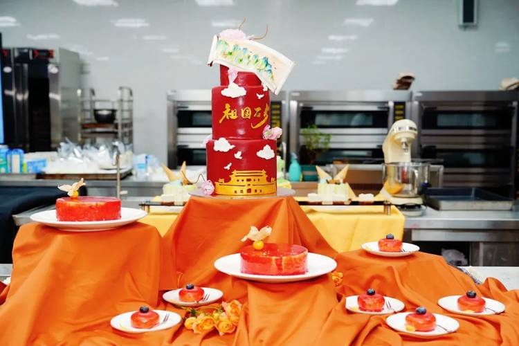 谷磊的作品《祖国万岁》以立体蛋糕塑形技艺为核心,在教练郝鑫老师的指导下,创新性地将天安门城楼纹饰融入蛋糕侧面,承载着国家主权与民族精神的象征意义;翻糖制作的千里江山图则与祥云、和平鸽交相辉映,寓意着祖国的大好河山和平长青。整个作品充分表达出对伟大祖国的礼赞与敬仰之情。