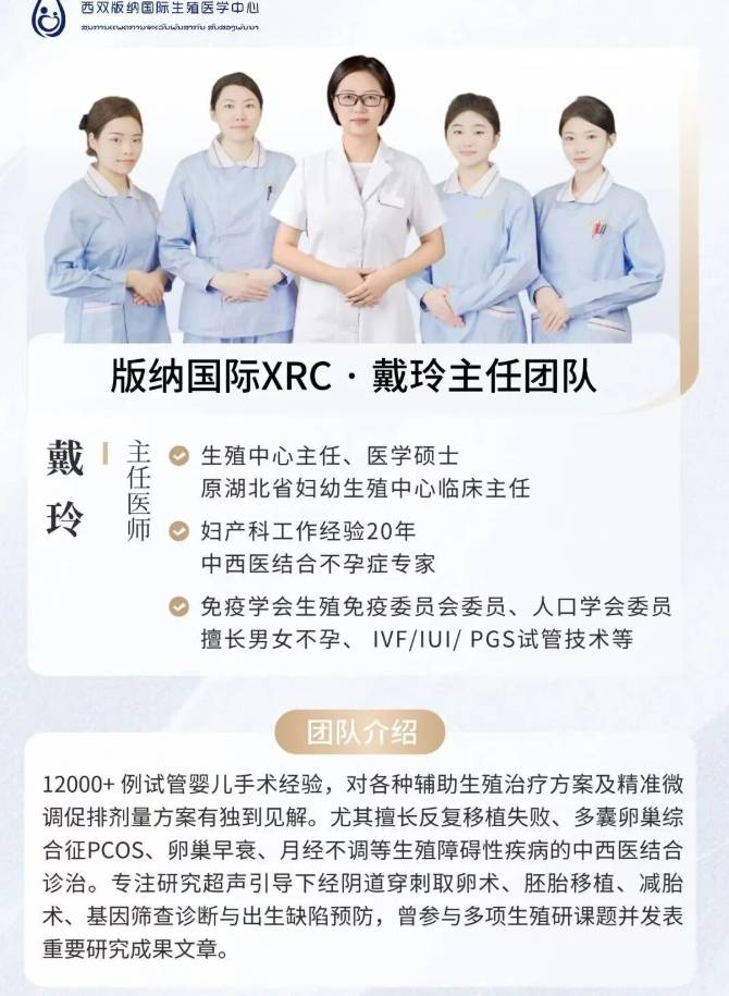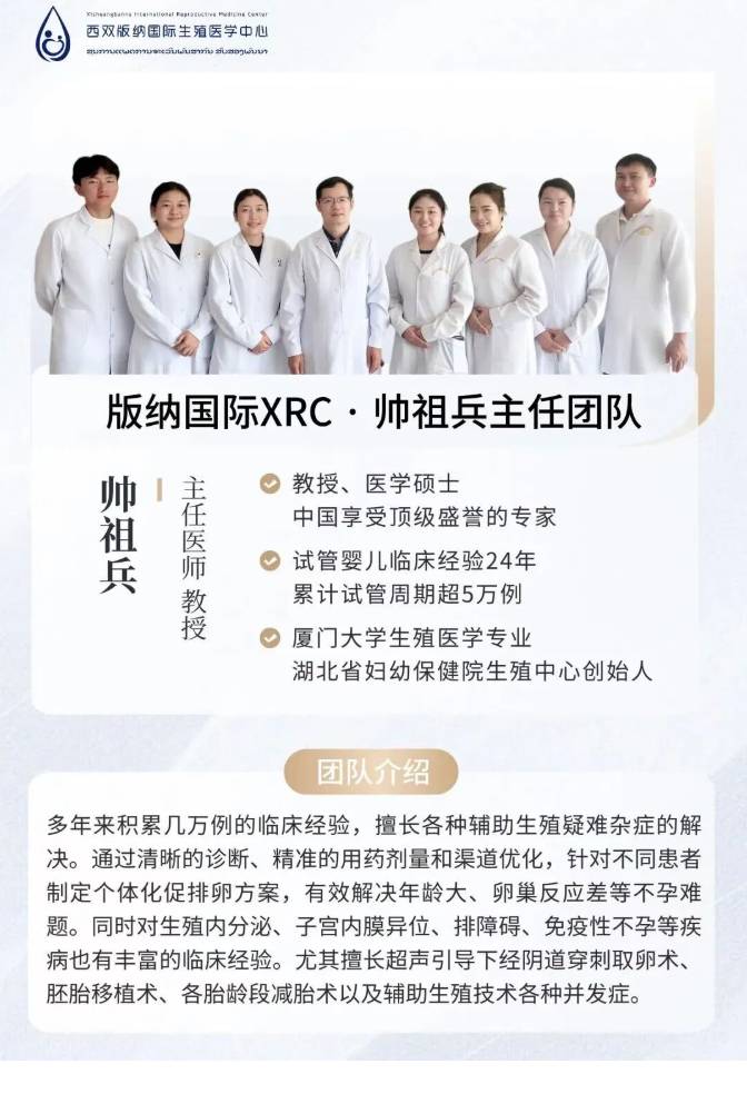 版纳国际XRC聘请的均为三甲医院的业内专家,由湖北省妇幼保健院生殖中心创始人帅祖兵教授和原湖北省妇幼生殖中心临床戴玲主任共同组建团队,拥有丰富的试管婴儿临床经验。
